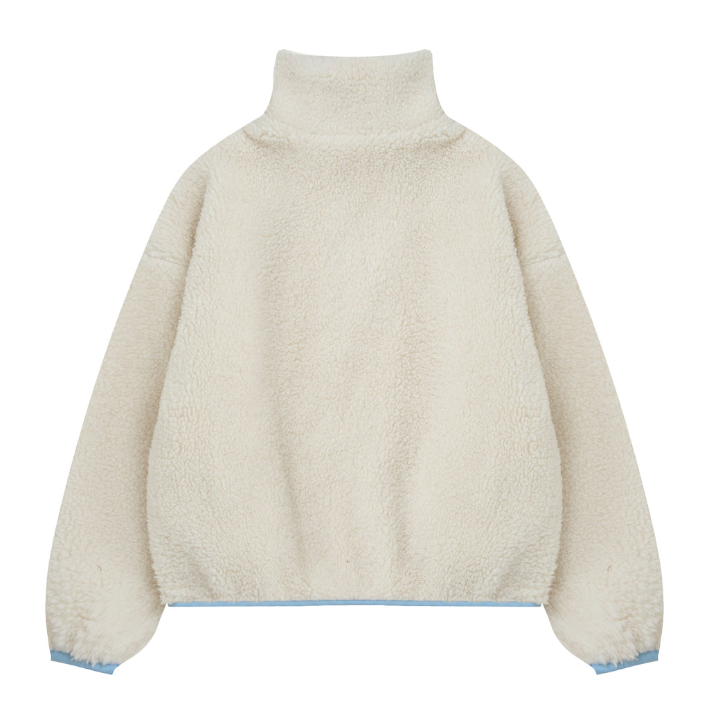 Made of super-soft, thick borg fabric with a full length blue-trimmed zip for easy on and off. The generously sized zipped printed cotton breast pocket keeps your things safe plus two convenient side pockets to keep your hands warm.